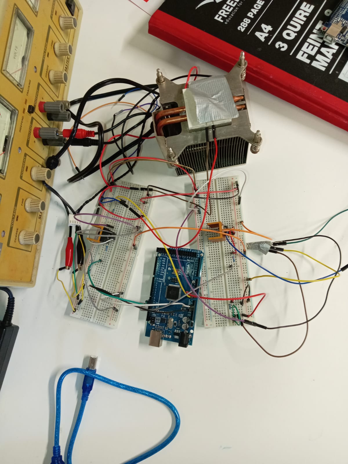 Prototype temperature control system using an Arduino Uno, LCD1602, and a power stage to drive TEC modules for experiments.
